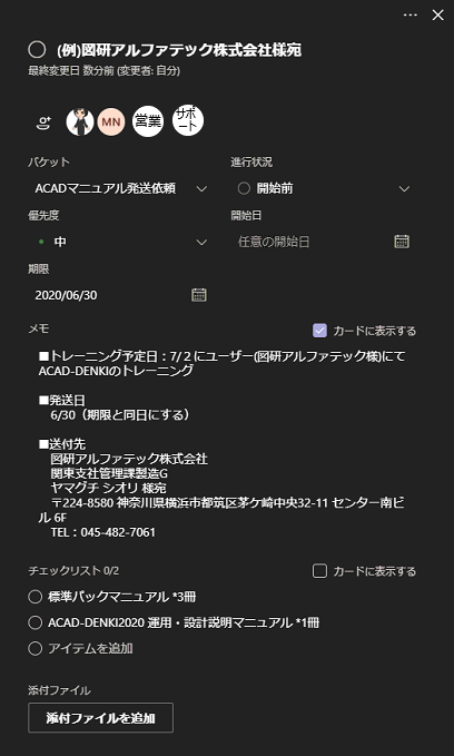 2)「ACADマニュアル発送依頼」と記載されているパケットの下の【+タスク追加】をクリックして、タスクを追加します。