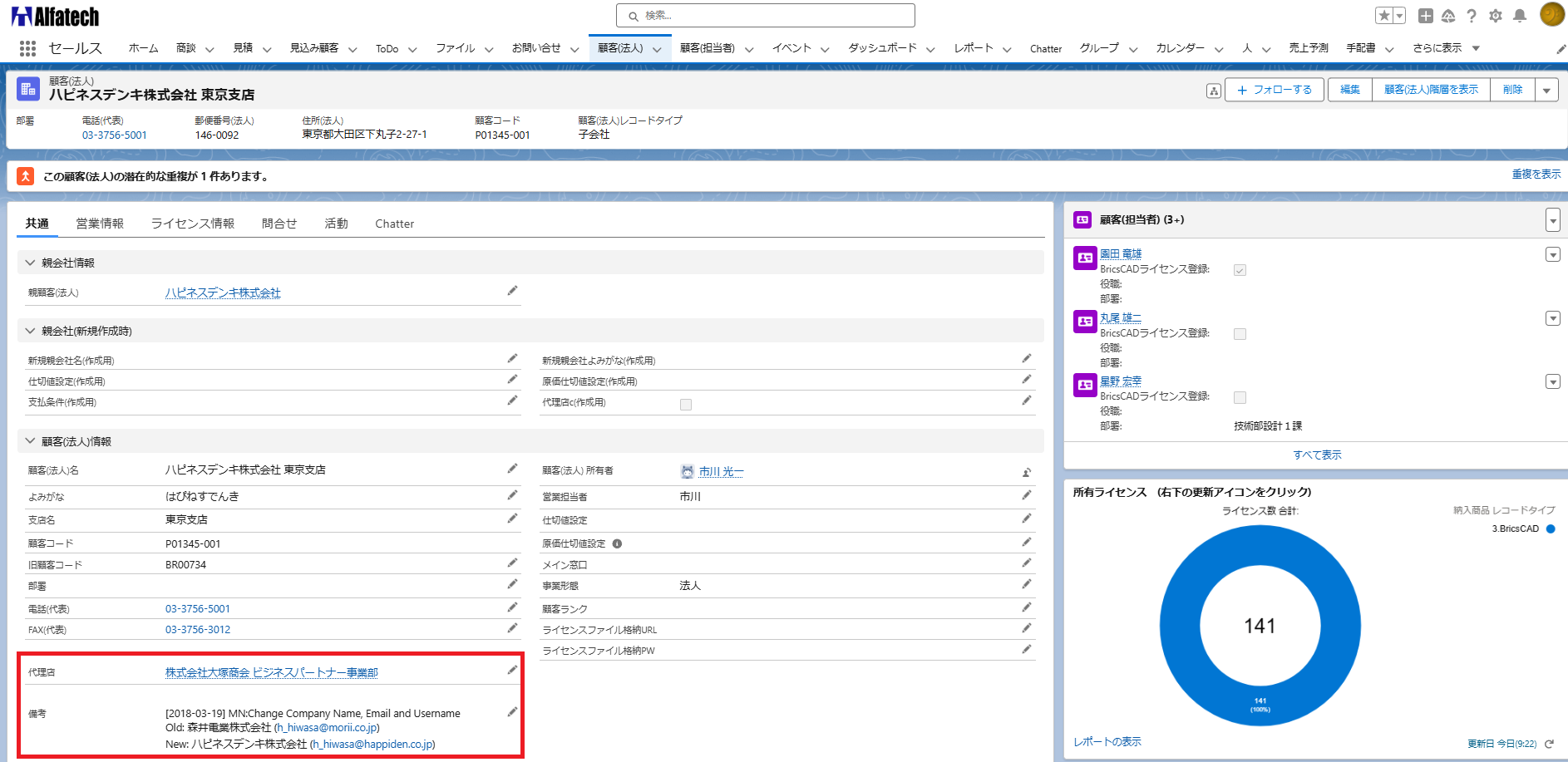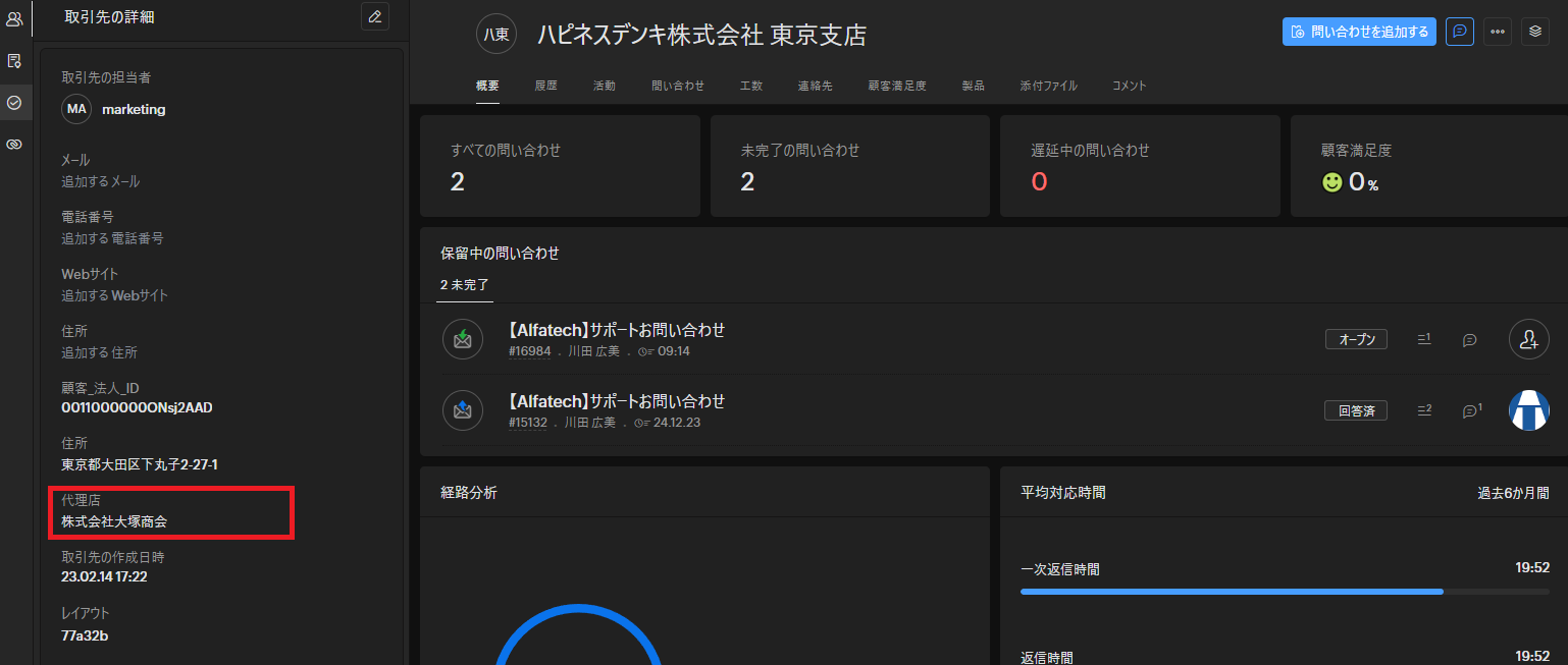 ・[顧客(法人)]の"代理店"項目"備考"項目を確認