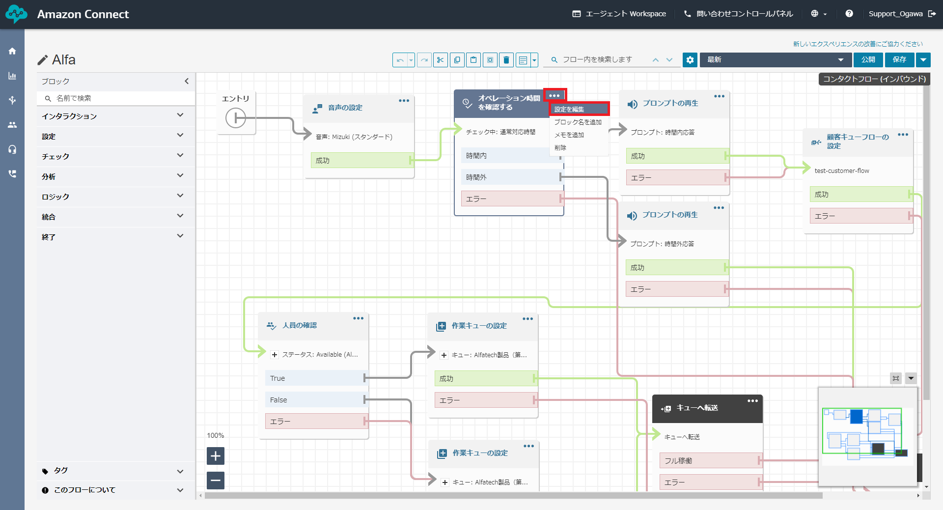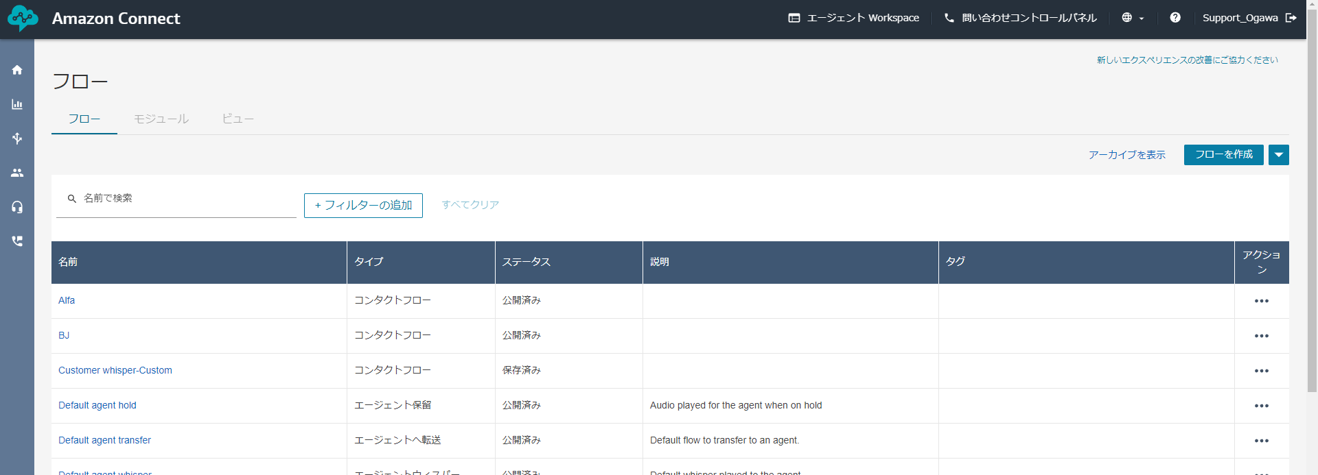 - AmazonConnectの下記ページにアクセスします。([ルーティング]-[フロー])