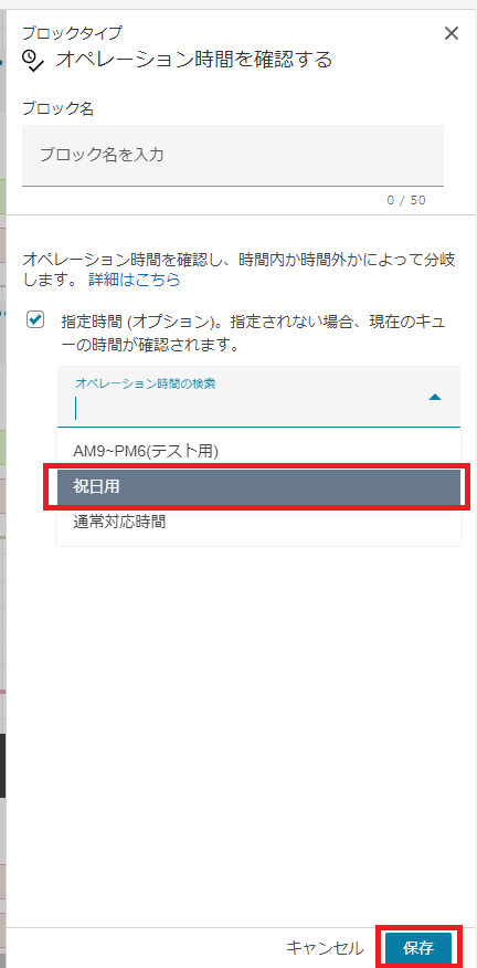 - 右側に設定パネルが展開されますので、[通常対応時間]⇒[祝日用]に切り替えて[保存]をクリックします。